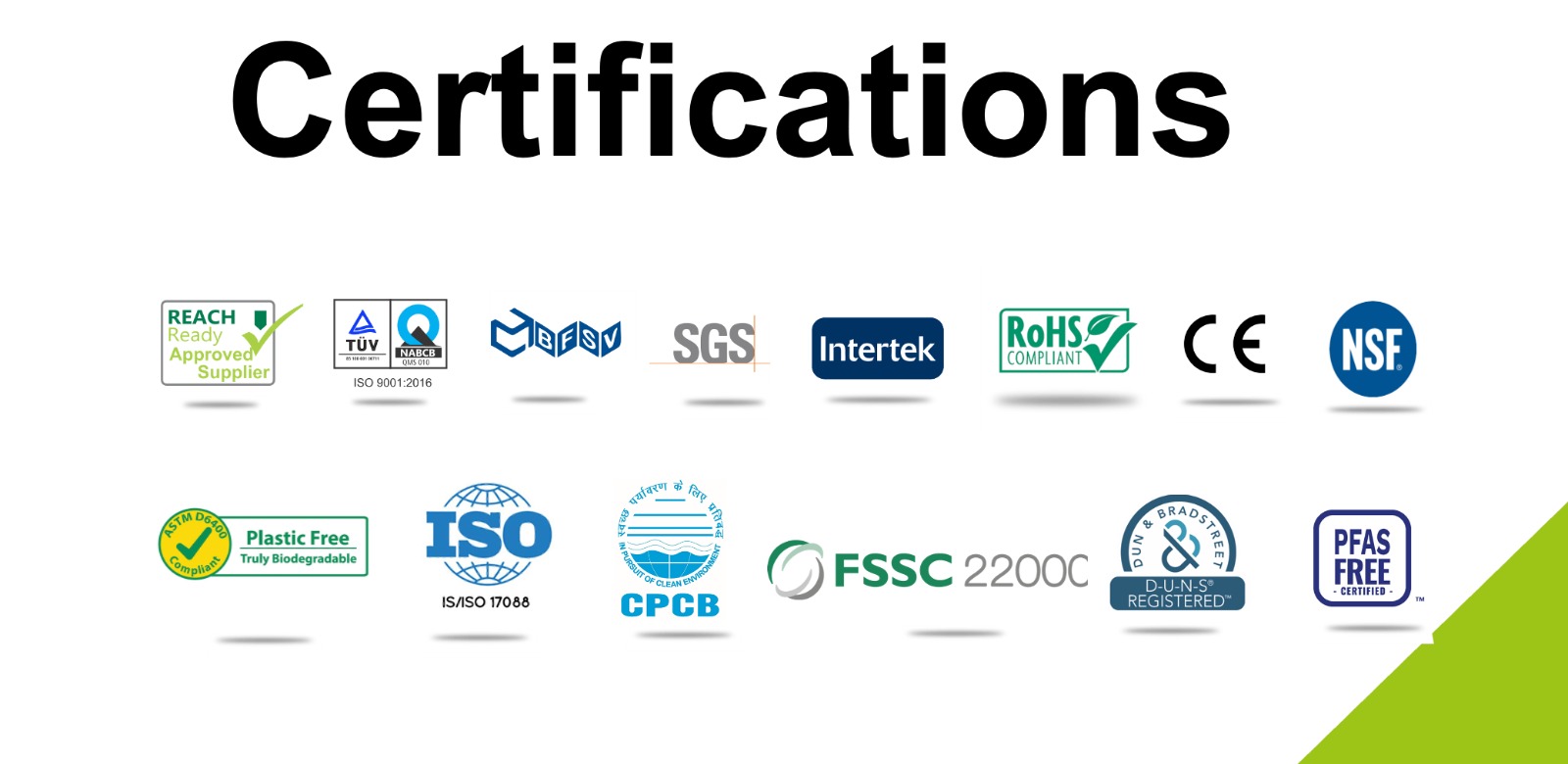 We are a legally incorporated and MSME-registered organization, holding globally recognized certifications including ISO 17088 and ISO 9001. Our compostable products are approved by the Central Pollution Control Board (CPCB), ensuring full compliance with national and international standards for quality, safety, and environmental responsibility.